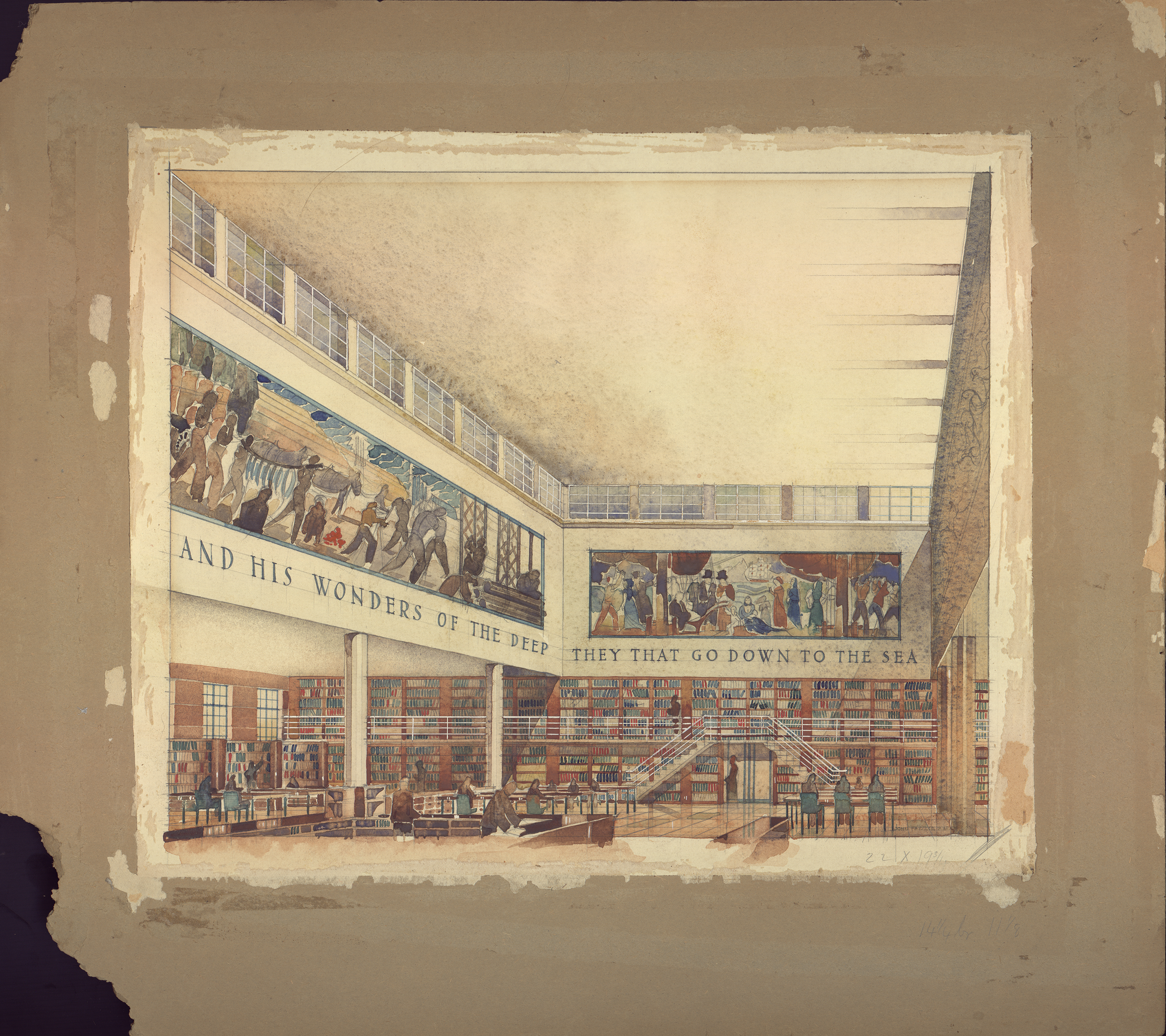 A perspective of the proposed reading room of the Cullen Library. This is a more restrained version of the earlier exuberant student project. It is interesting to see that the proposed murals were much larger and architecturally more effective than the ones which were actually executed.