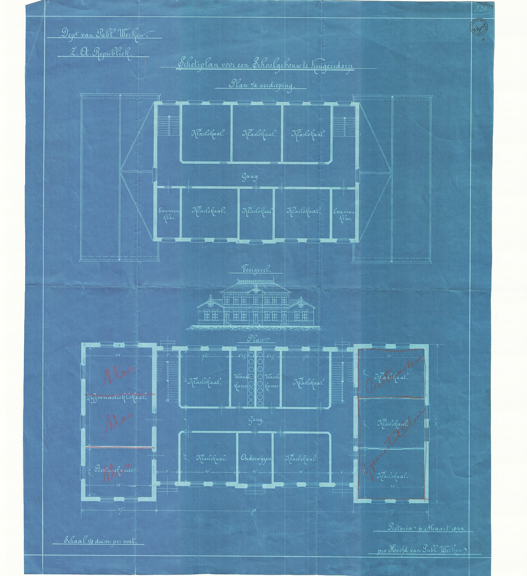 Digitised version of National Archive file S.3/2042 of first floor of school building, Krugersdorp, signed by "S.W. Wierda, Hoofd van Publ. Werken"