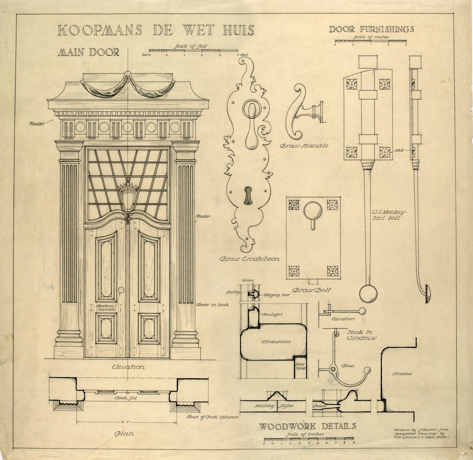 Drawings of the front door of the Koopmans De Wet House on Strand Street in Cape Town, made by John Fassler from measurements by F.M. Glennie and V.S. Rees Poole for prof. Geoffrey Pearse's book "Eighteenth Century Architecture in South Africa". See page 41 for a description, and Plate 28 for the drawing, which depicts the elevation, plan, woodwork details and brass door furniture. The door is flanked by teak pilasters, and topped by a fanlight with a lantern in the centre. Here, the architect Thibault was influenced by the Louis XVI style of France.