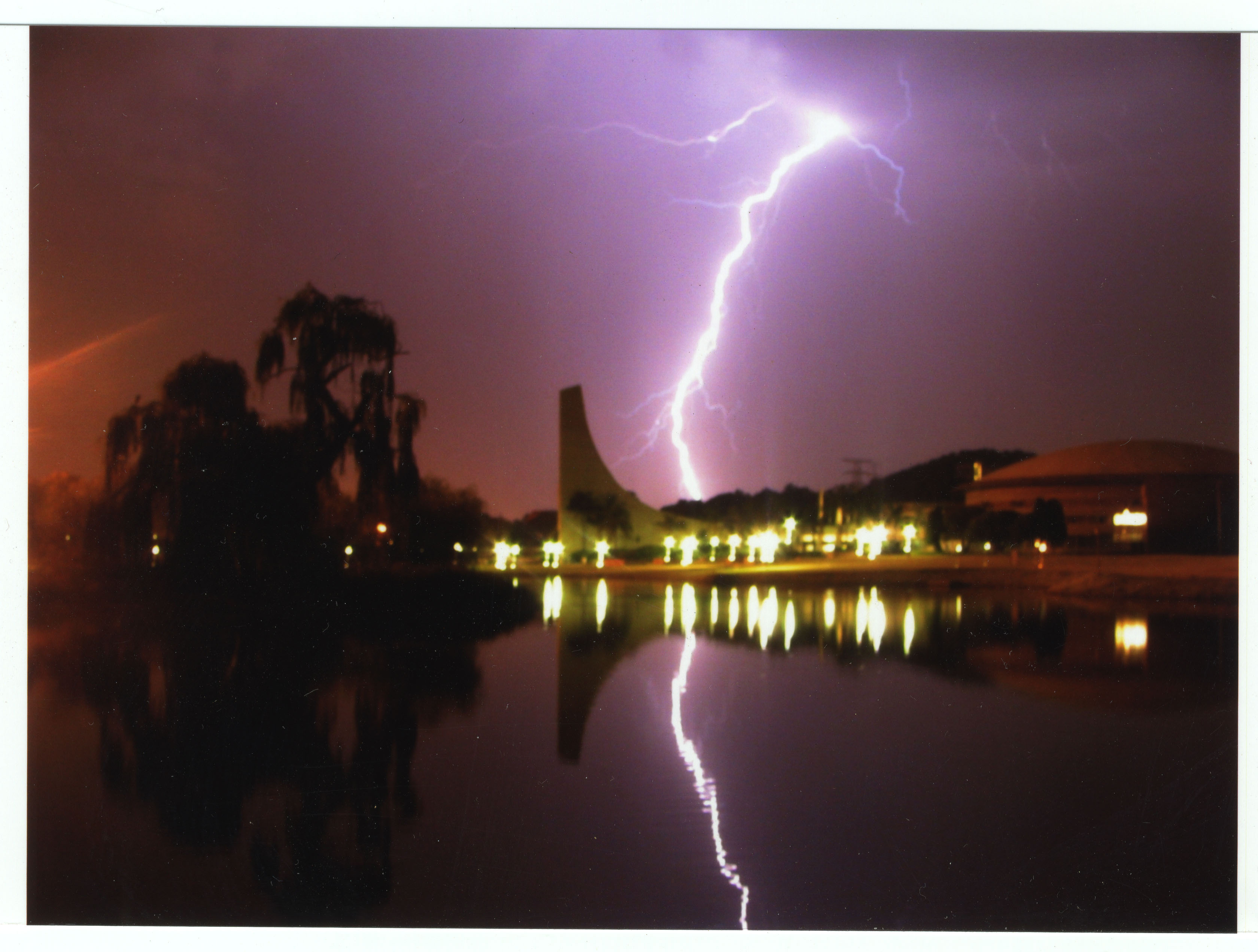 Evening distant front view of the Indoor Sports Centre with a lightning strike, LC de Villiers Campus, University of Pretoria.