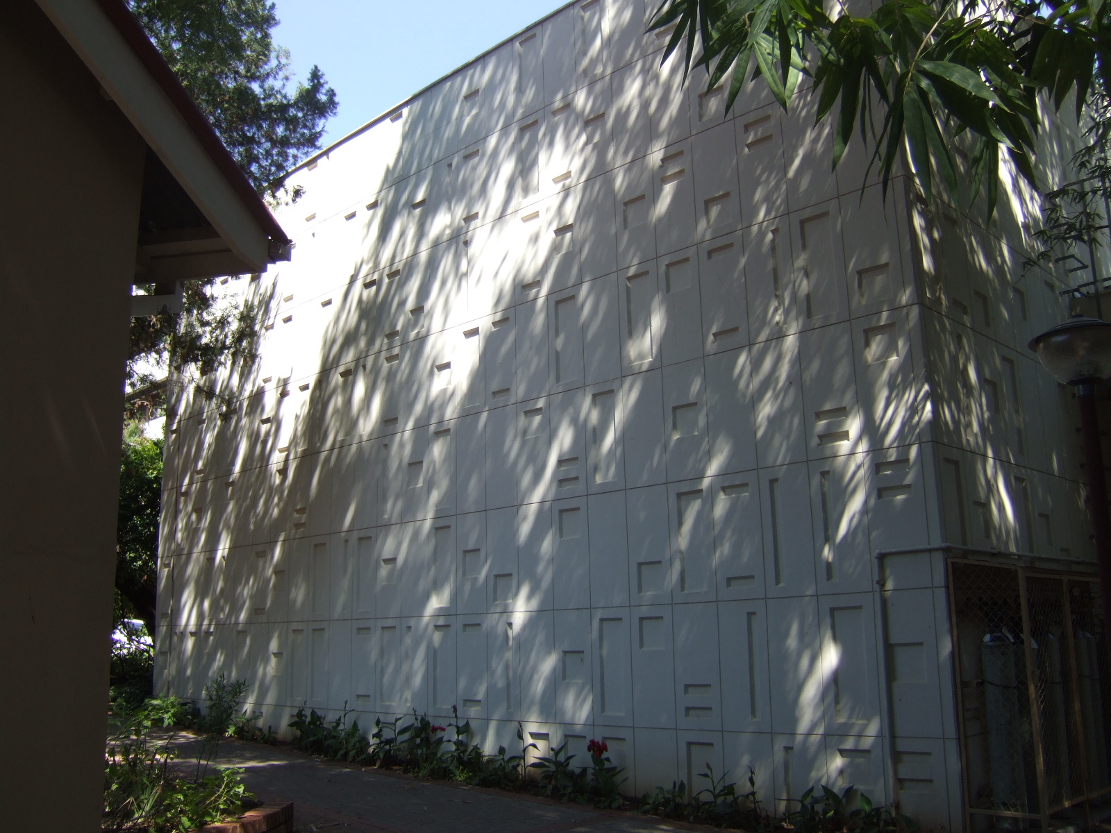 AE du Toit Auditorium & Annexe: The auditorium constructed in 1956, comprises two large lecture halls and was designed by Prof A L Meiring, head of the Department of Architecture and Building Sciences at the time. Because the building borders on University Road, it was designed without windows to minimize traffic noise. The building was named after Prof A E du Toit, the first professor of Mathematics and a former Principal of the University and was inaugurated in June 1957. An interesting feature of the structure is a grey relief against a red mosaic background on the southern wall designed by the artist Zoltan Borberéki and donated to the University by Prof Meiring. The larger of the fan-shaped lecture halls accommodates 700 students, while the smaller hall seats 250 students. Van der Graaf Accelerator: Constructed in 1963, this building forms part of the Department of Physics. The facility consists of a proton accelerator and a sub-critical reactor module which is utilised for training and research in the field of nuclear physics. Since its inauguration in 1964, the University and the Council for Scientific and Industrial Research (CSIR) have cooperated closely in this field and more recently the University has broadened its international research connections in this regard.