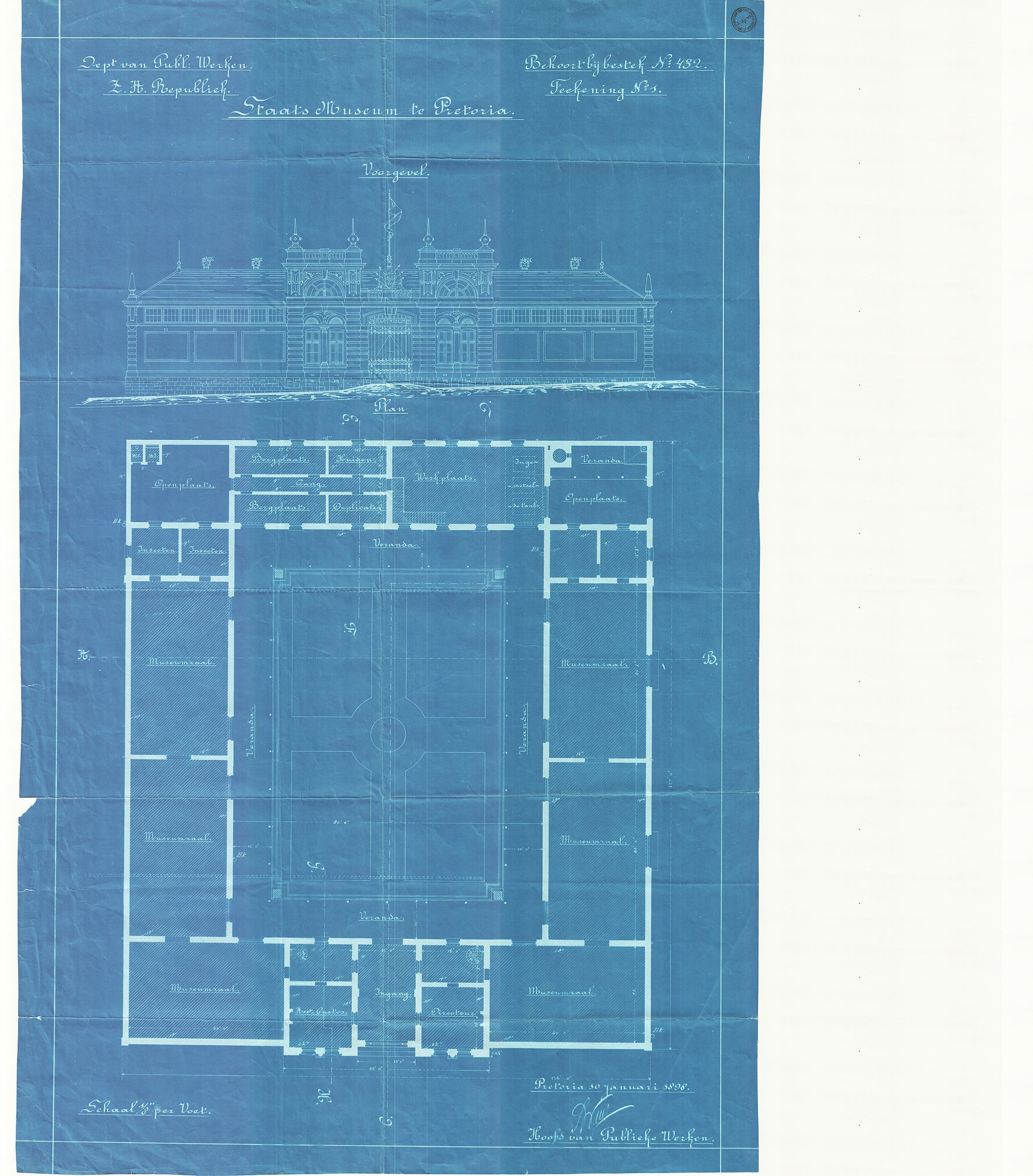 Digitised version of National Archive file S.2/170. Drawing of the State Museum, Pretoria, depicting the "Voorgevel en Plan" (Front Gable and Plan). Signed by "S.W. Wierda, Hoofd van Dept. van Publieke Werken"