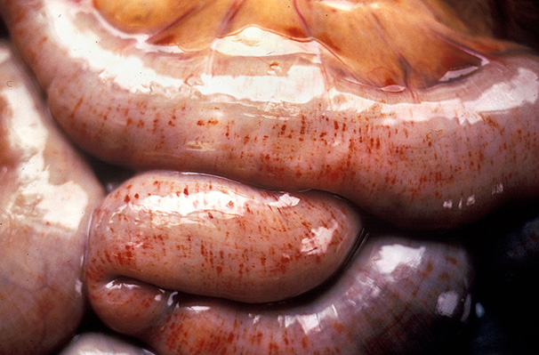 Rift Valley fever (RVF) in an adult bovine : numerous petechiae in the serosa of the colon