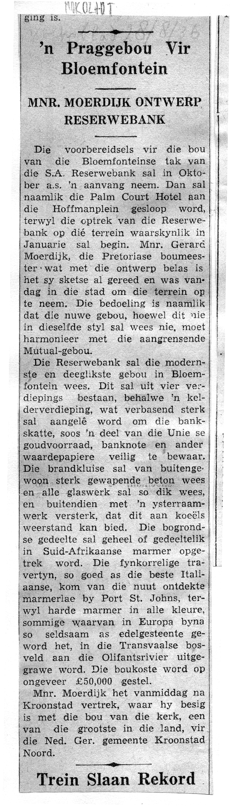 | dc.description.abstract | AFRIKAANS SUMMARY: Die argitek Gerard Moerdijk het sy finale planne van die Reserwebank in Bloemfontein voorgelê. | en |
