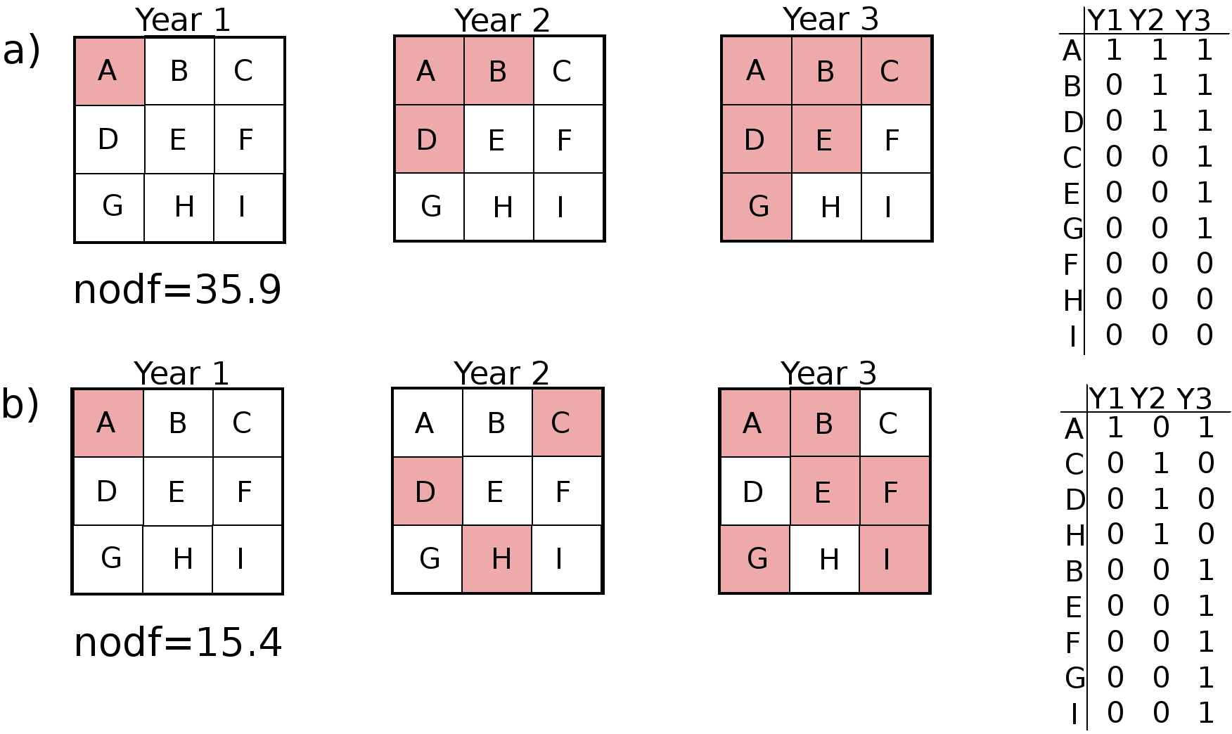 S5 Fig. Schematic examples of incremental range expansion (a) out of an initial core area as well as (b) a patchy range expansion were no area is occupied two consecutive years, their nestedness values as well as the association matrices used to calculate nestedness. https://doi.org/10.1371/journal.pone.0209972.s005