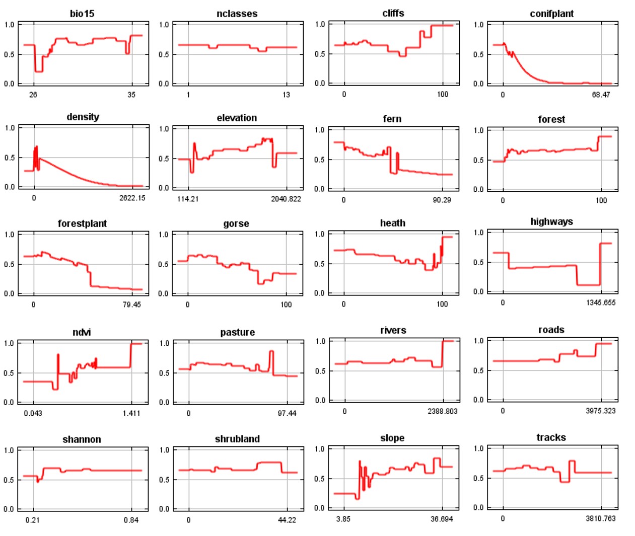 S7 Fig. Associations between predicted suitability estimated from the fine scale model each of the included environmental predictors. https://doi.org/10.1371/journal.pone.0209972.s007