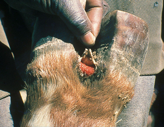 Acute foot-and-mouth disease (FMD) : feet lesions showing erosive lesions between the two digits