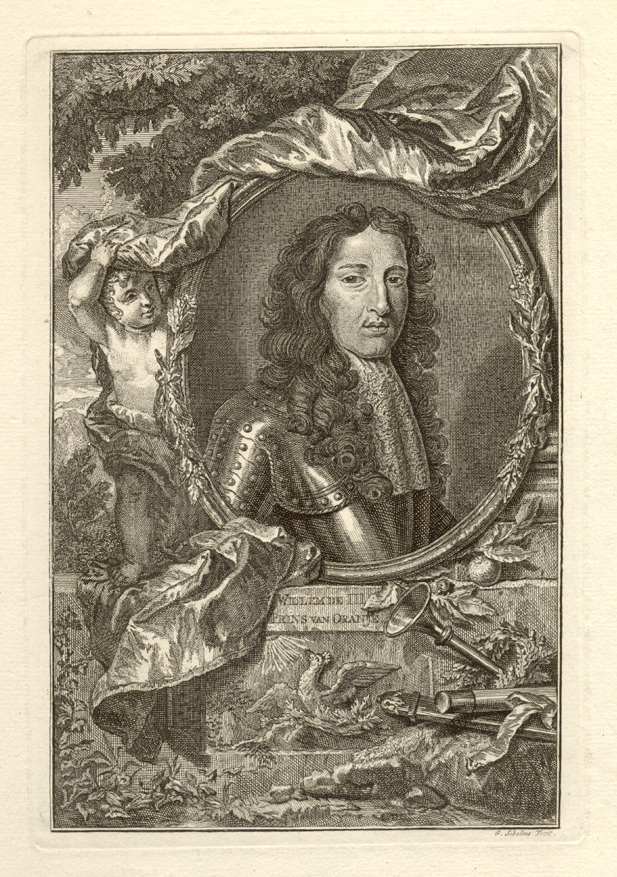 Oval Portrait of Willem III with a child holding the frame and a phoenix at the bottom. Prince Willem III (1650-1702) of the Netherlands became King William I after the glorious revolution in 1688. He was married to Mary Stuart II of England.