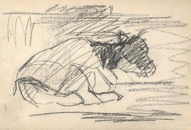 Two charcoal sketches depicting a reclining cow in a landscape with a man in a rocking chair under a tree on the back.