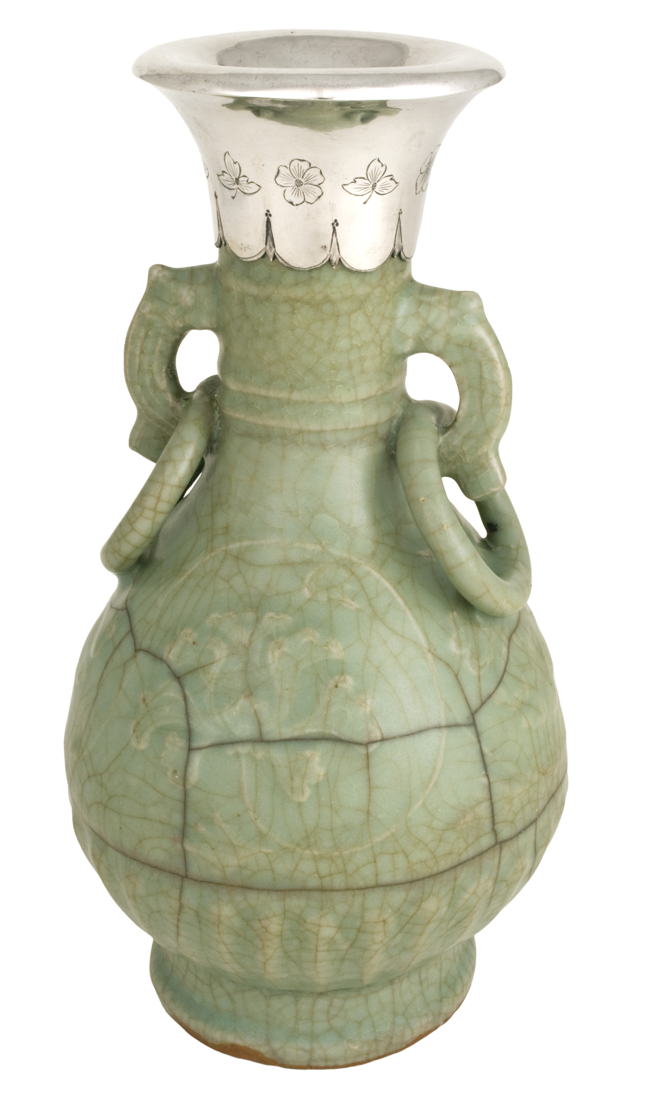 This Yuan dynasty Longquan celadon two-handled bottle vase with fixed rings has moulded sides, a fluted lower body and a thick celadon glaze. The lip of this vase was probably broken in antiquity and consequently it was repaired with a silver lip. This type of more ornate pieces was made to suit Mongol taste and was often copied from contemporary bronze forms. The smooth, pale-grey body used for Longquan celadon was a substantial technical achievement, but the real magic was the sea-green to blue-green to olive glazes. These glazes were exceptionally thick and their similarities to jade are both striking and deliberate. The reddish re-oxidisation of the exposed Longquan clay complemented the olive green celadon glazes effectively and this porcellaneous material was also remarkably tough in everyday use. It became one of the most popular and widely exported of all Chinese ceramics