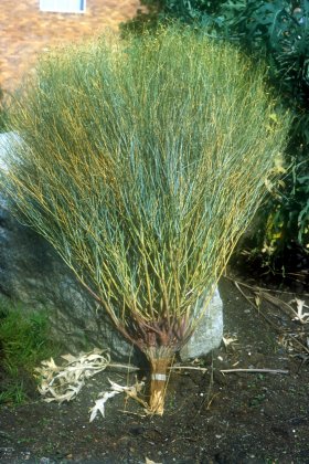 Botanical description: General: A dense, much branched bottle-green shrub, ±1,5 m high with almost leafless branches which are finely hairy at the tips. It has the appearance of an implanted tuft of grass in the sand and only lives for two to three years.