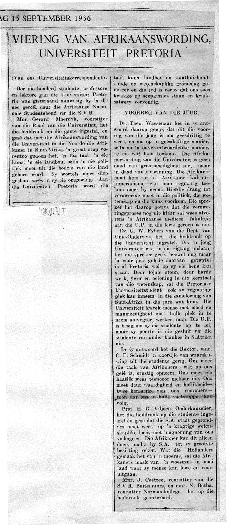 Moerdijk, Gerard, University of Pretoria, Universiteit van Pretoria, Afrikanerkultuur, Taalbeleid, Language policy, Wassenaar, T., Eybers, G.W., Afrikaner culture, Schmidt, C.F., Viljoen, H.G., Moerdyk, Gerard
