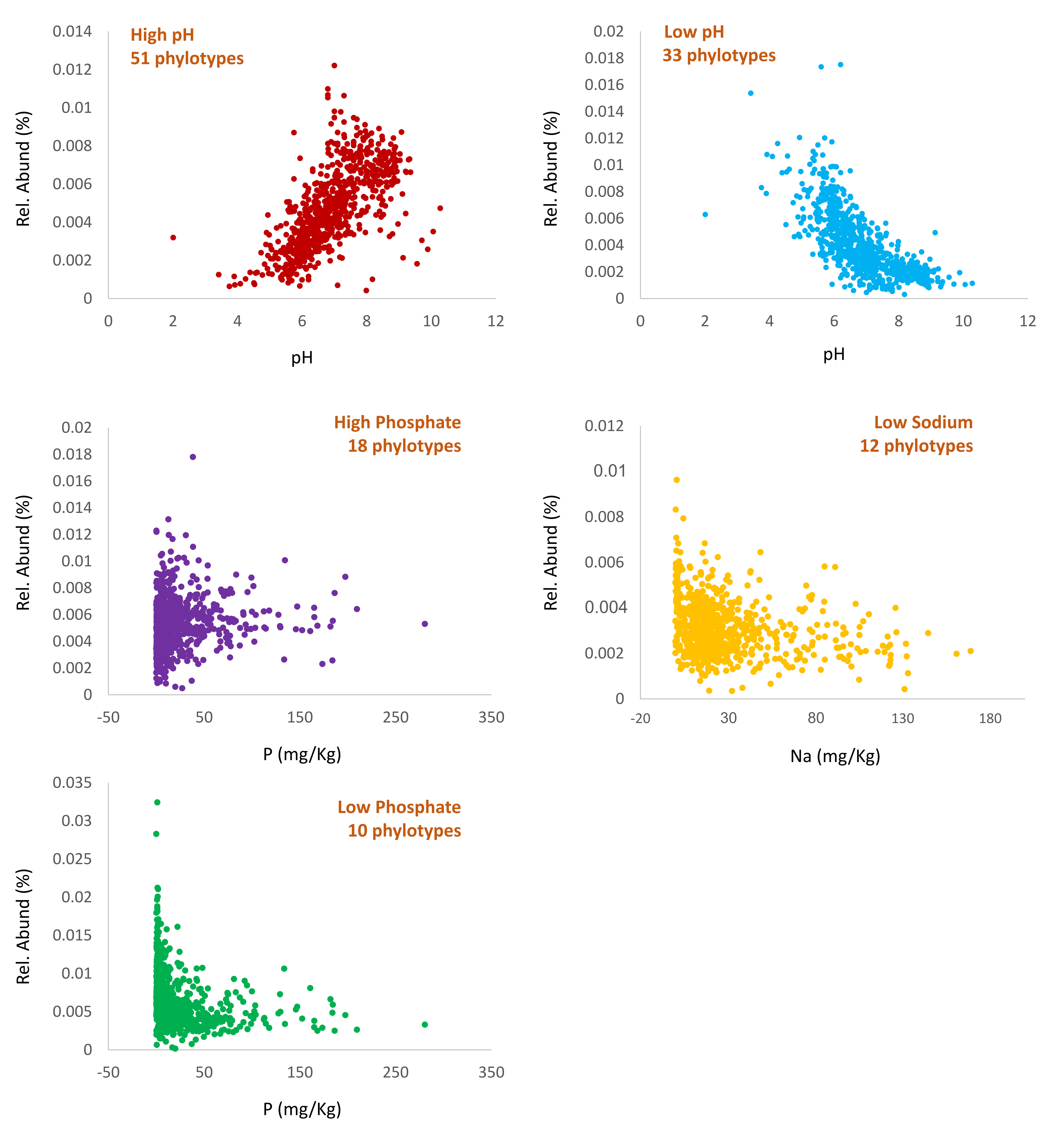 Additional file 5. Figure S5. Relationship between the relative abundance of dominant phylotypes across soil samples and their main environmental predictors, as determined by semipartial correlation analysis. Phylotypes were grouped into environmental categories based on the correlation between phylotype and its major environmental predictor: positive correlation with pH – high pH; negative correlation with pH – low pH; positive correlation with phosphate – high Phosphate; negative correlation with phosphate – low Phosphate; negative correlation with Sodium – low Sodium.
