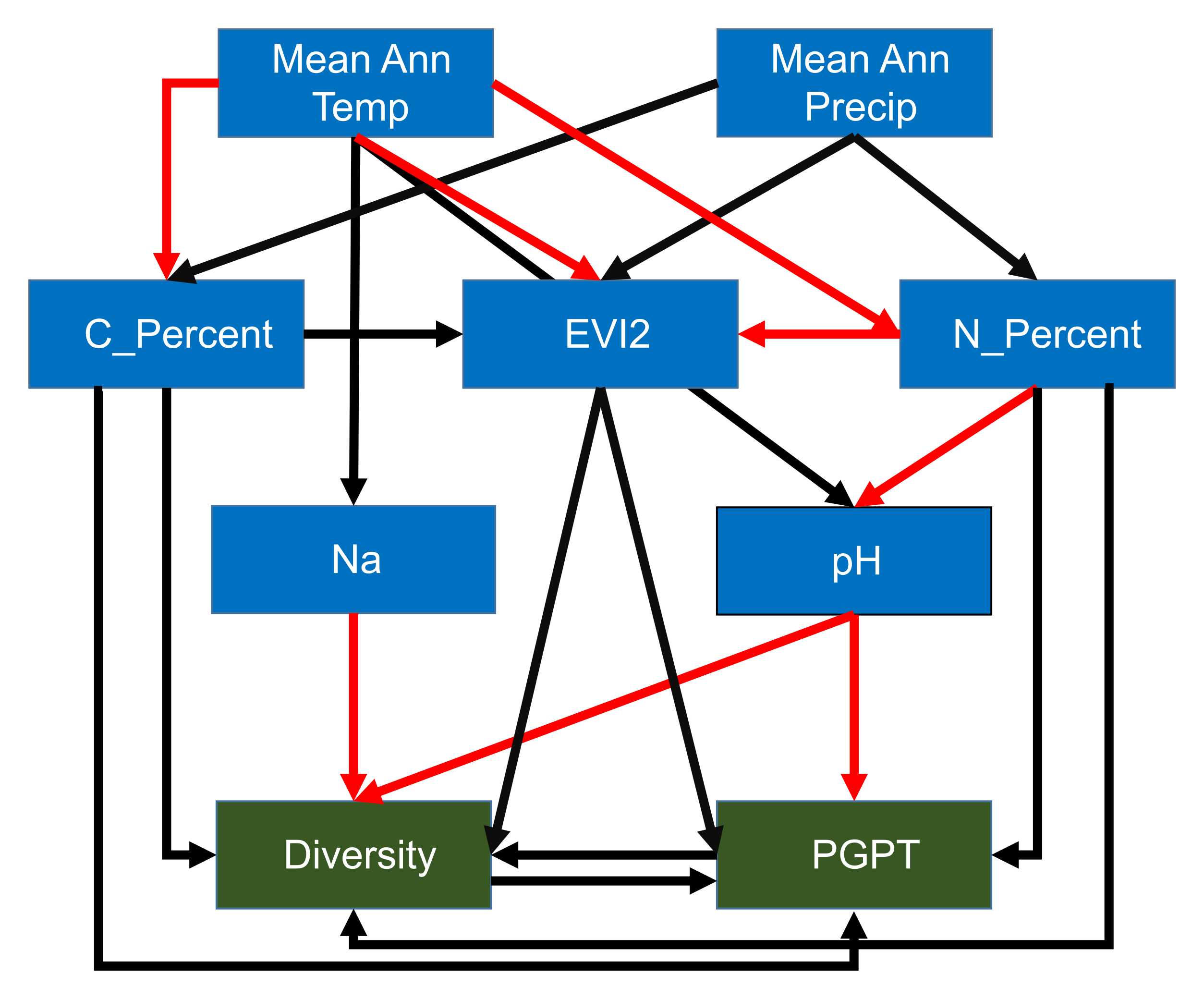 Additional file 6. Figure S6. A-priori ecological model tested using SEM. MAP and MAP are represented as exogenous variables (black rectangles), soil chemistry and vegetation index are represented as endogenous variables (blue rectangles), while the Shannon diversity and abundance of PGPT are represented as response variables (green rectangles). The color and direction of the arrows represent the nature and direction of the causal relationships between variables: red – negative relationship; black – positive relationship.