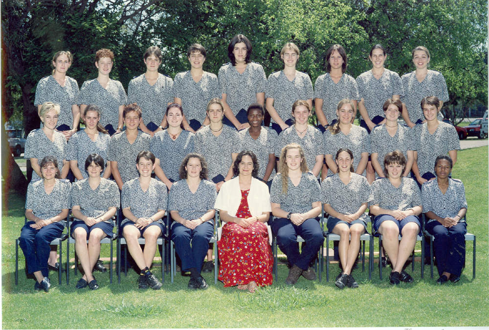 Formal colour photo taken outdoors of the 1998 DVN class with Dr E Scheepers. The names of the veterinary nurses on the photo are: Front (from left to right): C Stokes, CP Crawford, E Bornman, R Strachan, Dr E Scheepers, O van der Merwe, TG Peak, C Troskie, AK Rammekwa ; Second row: M Dreyer, D Germena, J Steyn, AE Veiga, T Cable, MS Ntshole, CV Roper, VH Barrow, A van der Merwe, T Lubbe ;