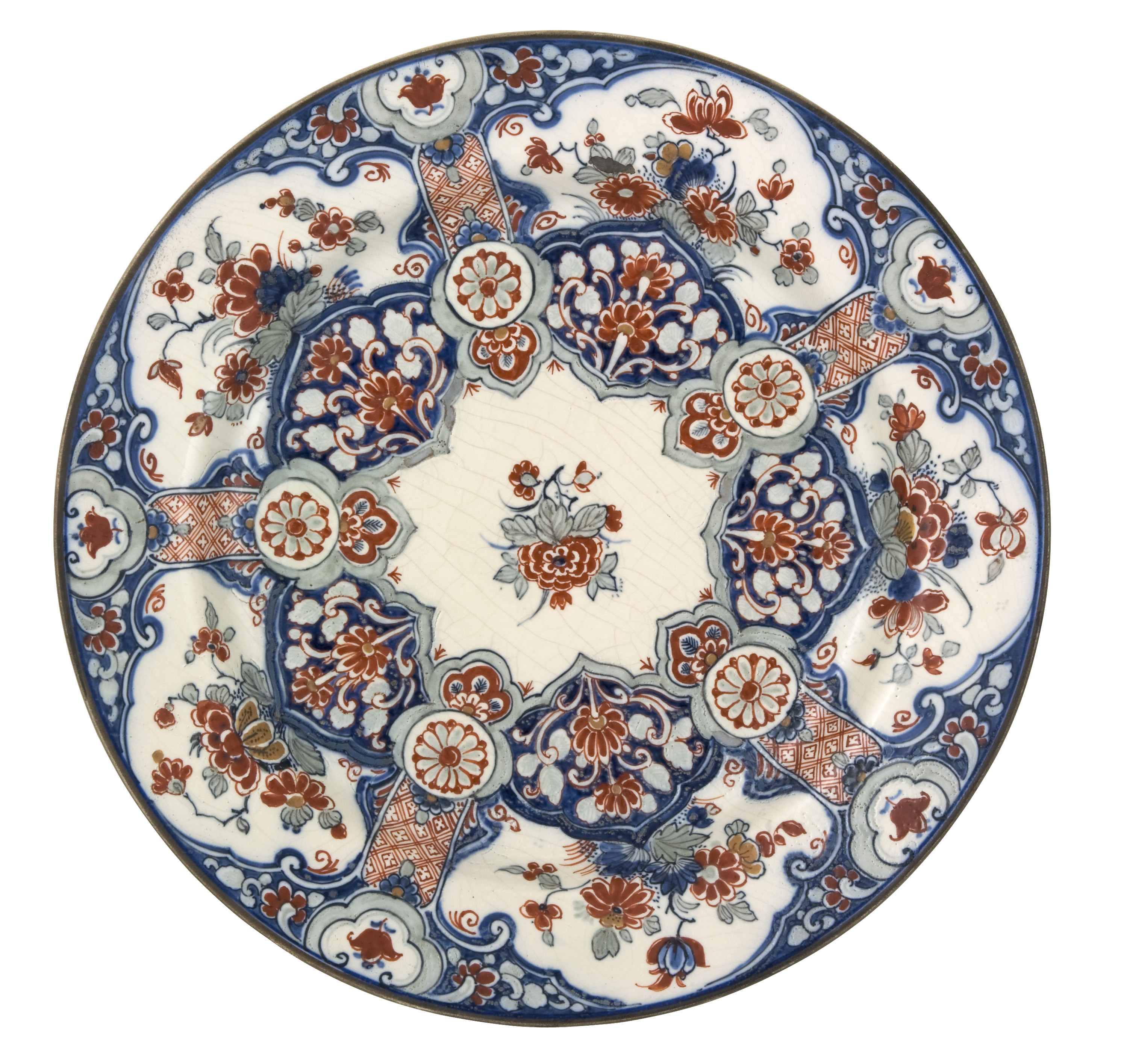 This round tin-glazed Delft dish is decorated with floral panels and medallions in the Japanese Imari-style. The dish has a sunken, glazed base marked with “De Porceleyne Fles” mark, the letters “F” and “JX” and the word “Delft” all in underglaze blue as well as the incised letters “WZ”. This dish was made by J Jansen, who started working at De Porceleyne Fles in 1902. During the late 19th and early 20th centuries the designers at De Porceleyne Fles experimented with various different decorative styles, such as this so-called Imari-style dish.