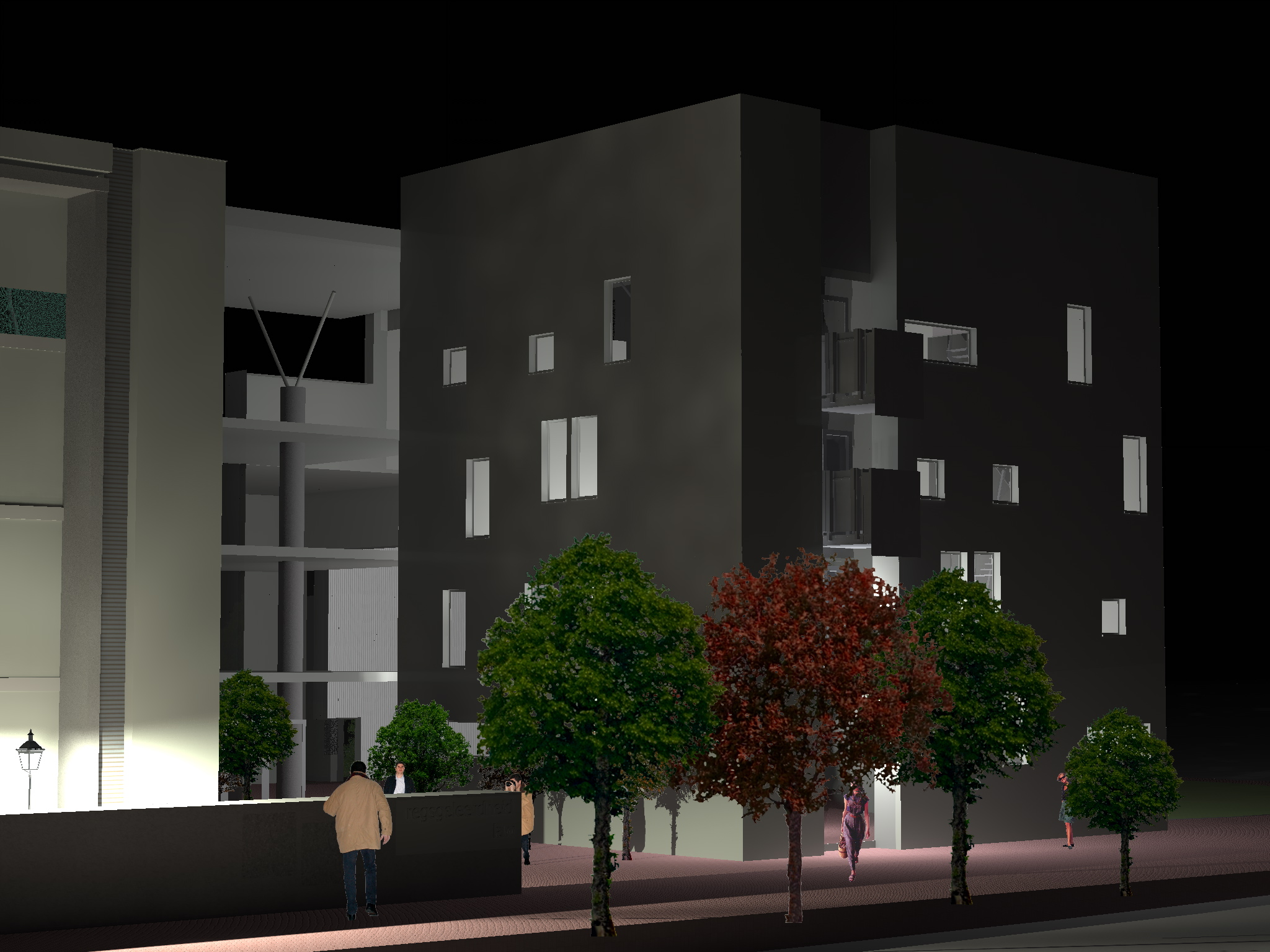 Virtually rendered coloured night-time model of Law building, size 2048x1536.