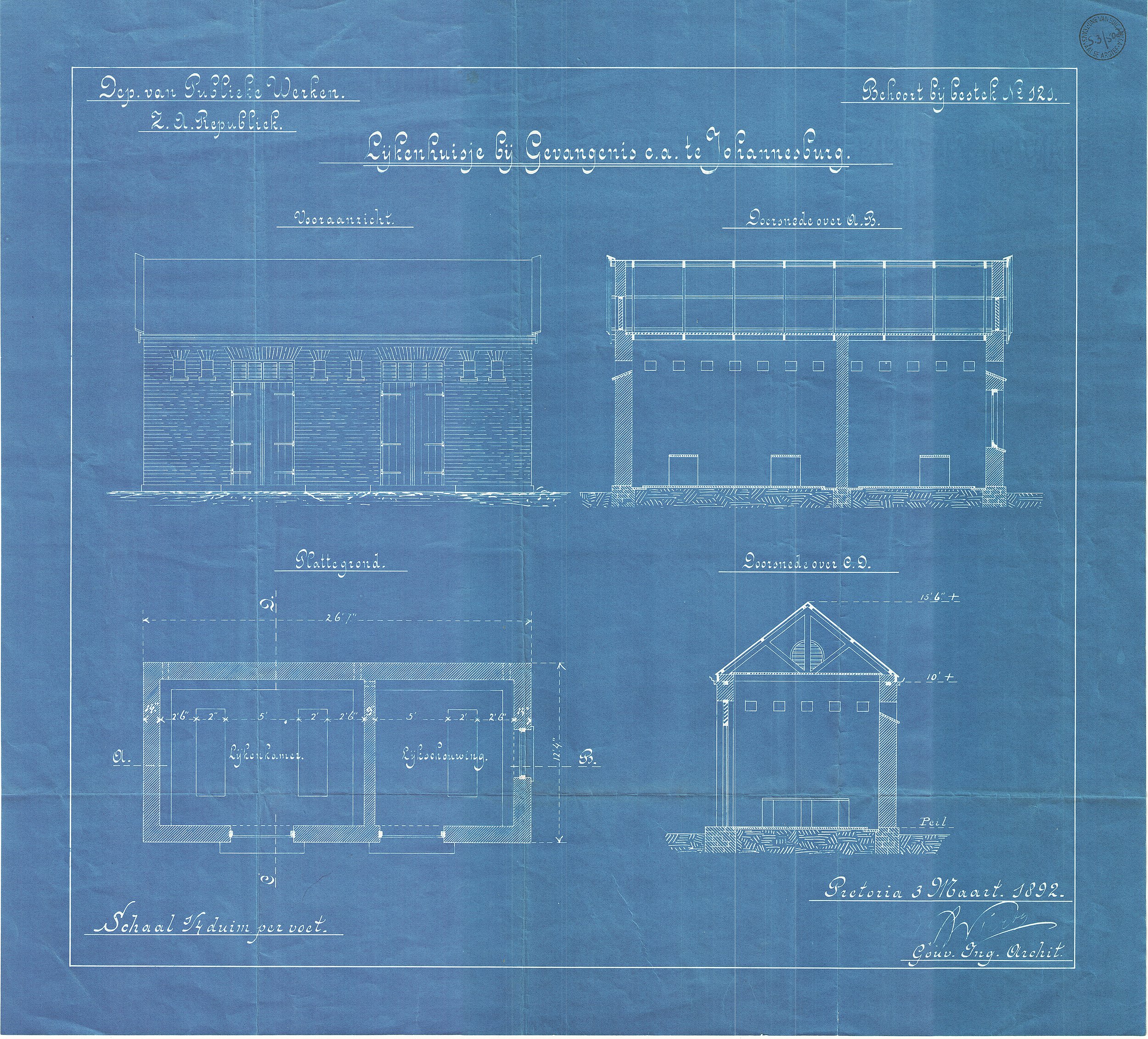 Digitised version of National Archive file S.3/502. Drawings of the mortuary, Johannesburg Prison, signed by "S.W. Wierda, Gouv. Ing. Archit."