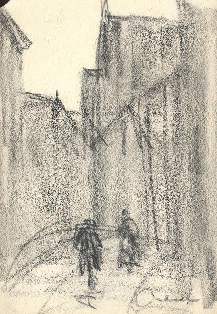Charcoal sketch of a man and woman moving along a roadway probably in Dordrecht, with the back of "De Oude Kerk" looming on the right .