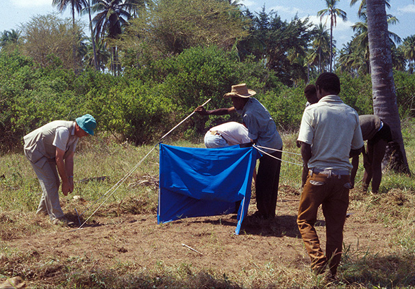 Field staff busy erecting a tsetse fly trap