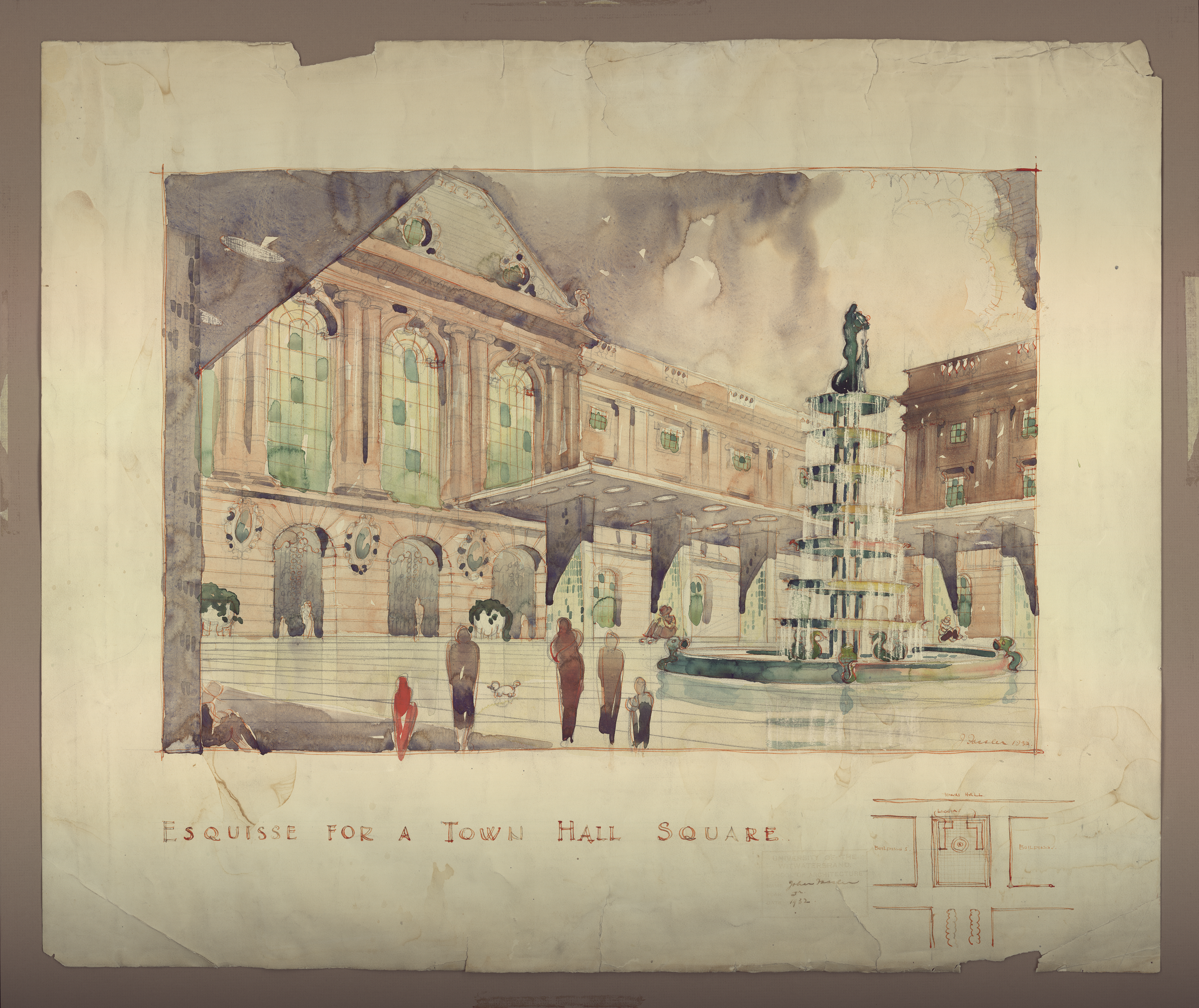 A civic space with the Neo Classical façade, Art Deco fountain and Modernist bus shelter reflecting all the influences at work in the Architectural School at that time. An esquisse was a one day design.
