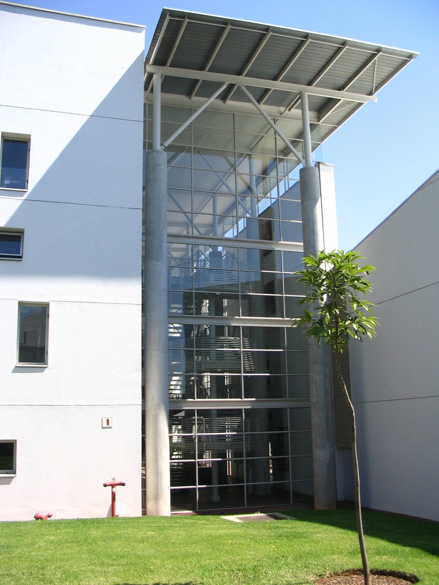 This imposing building with its brilliant white walls and extensive glazing is one of the newest and most modern structures on campus. Designed by the architect firm Kruger-Roos, the design was intended to reflect the transparency of the legal world. The building was inaugurated by President Thabo Mbeki in 2005 and was voted the third best building in Gauteng in a survey by Visi magazine and the South African Institute of Architects (SAIA) in 2006. It houses most of the Faculty of Law’s facilities on campus including staff offices, an auditorium, lecture halls and the Oliver R Tambo Law Library. Exquisite art works, mostly from the Sanlam Art Collection, by artists such as Diane Victor, Ike Nkoana, Andrew Verster, Anton Uys, Trevor Coleman, Judy Woodborne and Hermine Spies are on exhibit in the building.