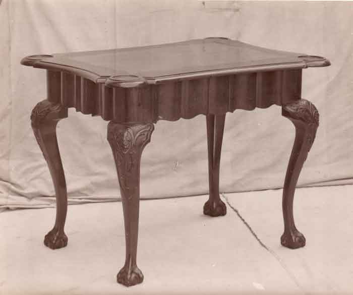 Photograph depicting a table, probably from the early 19th century. It has cabriole legs with carving on the knees, a linenfold apron, and ball and claw feet. It appears to be a card or games table. More information welcome!