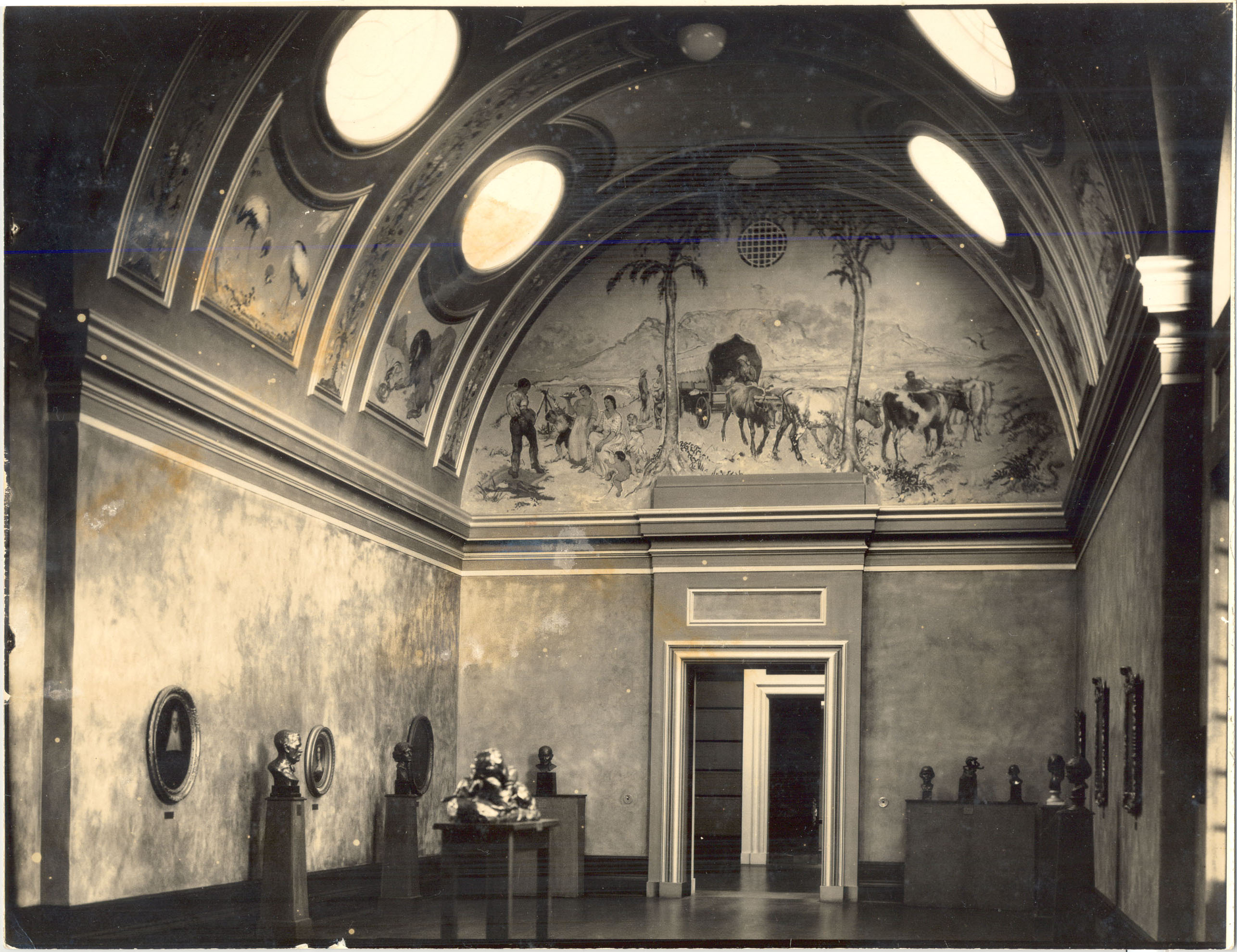 Black and white photograph of the interior of a vaulted room including an exhibition of busts, decorated ceiling and statues along the interior wall of the room.