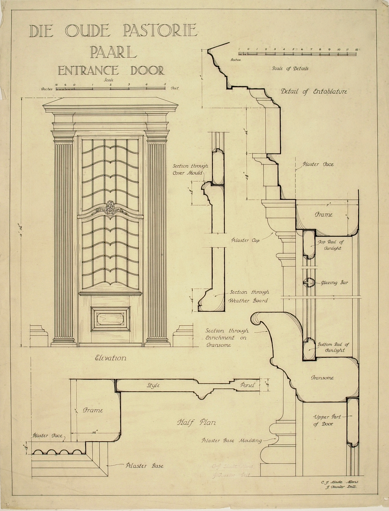 Elevation, sections and details of the entrance door of Die Oude Pastorie (The Old Parsonage), a Cape Dutch house in Paarl. Redrawn by John Fassler from measured drawings by C.J. Slade for prof. Geoffrey Pearse's book "Eighteenth Century Architecture in South Africa" – see page 48 for a description, and Plate 101 for the drawing.