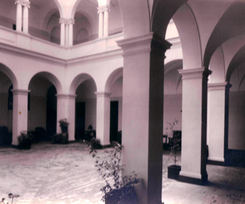 From the Pearse Collection: photograph depicting an unknown building with a courtyard surrounded by a loggia. The lower columns are square while the upper Ionic columns are connected by arches. Photograph probably considered for prof. Geoffrey Pearse's book "Eighteenth Century Architecture in South Africa", but never included.