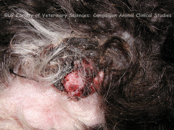 PHOTO 1: Ulcers are normally a consequence of a serious underlying pathological condition. The epidermis and basement membrane is lost with ulcer formation. There are various potential underlying causes: it may be a hereditary defect that causes an abnormally thin and sensitive skin, it may be caused by infectious or systemic diseases, or by immune-mediated disorders such as hyperadrenocorticism. PHOTO 2: Crusting is formed by dried exudate or secretions adhering to the skin surface. Dried material tends to adhere more tightly to hairy areas than in glabrous skin, causing crust to have the potential to become unusually thick. The nature of crusting can give insight to the underlying cause; for example, honey coloured crust is typically caused by an infectious agent, while dark crusts imply tissue damage or haemorrhage. PHOTOS 3,4: The skin is the most common site of tumour development in the dog, representing more than 30% of tumours. Clinical evaluation of cutaneous tumours is challenging, since the clinical appearance of tumours varies widely. Cutaneous neoplasms originate from various components of the skin, with the majority being of epidermal and ectodermal origin and benign.