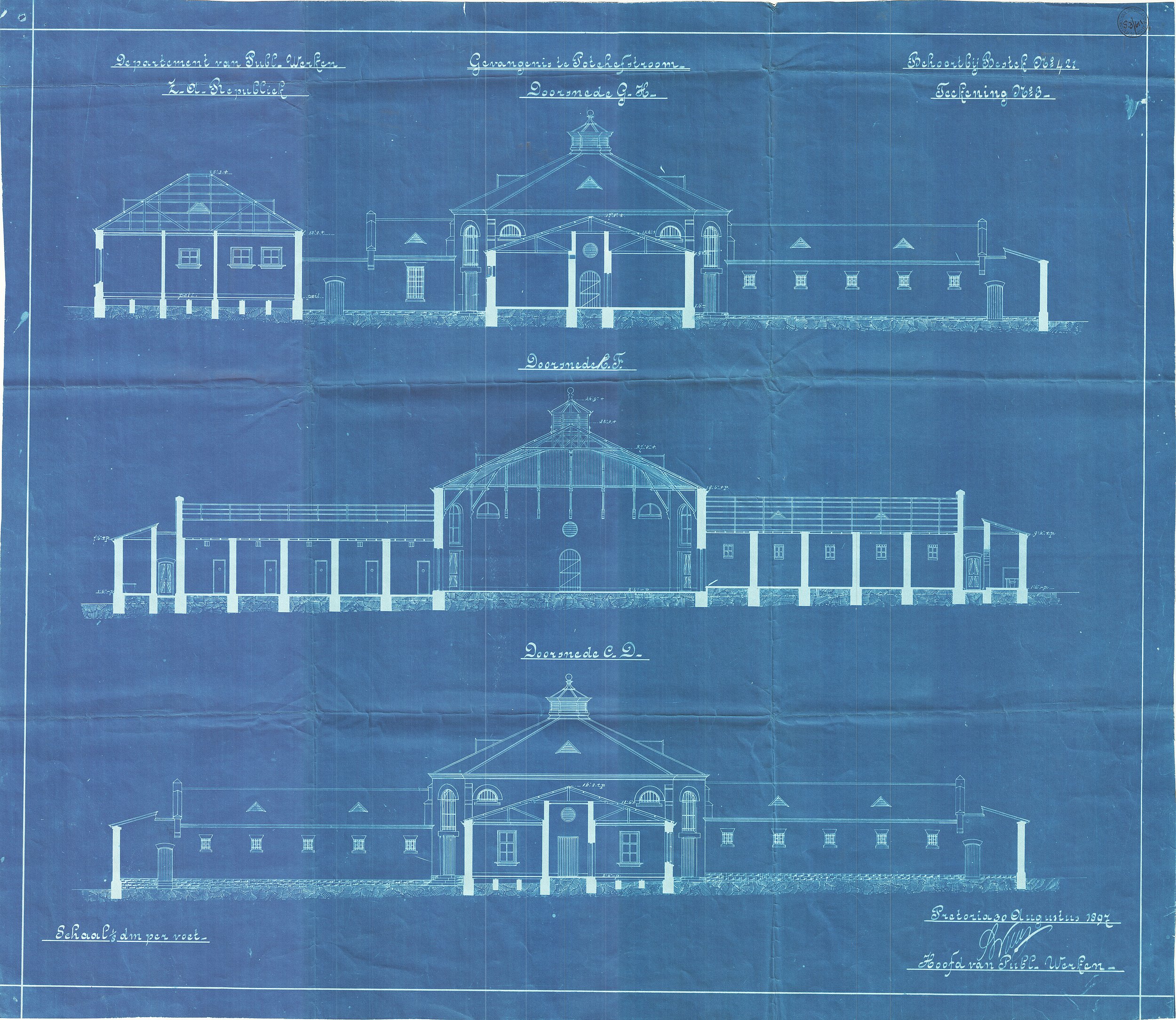 Digitised version of National Archive file S.3/611. Drawing of the Prison, Potchefstroom, depicting the "Doorsnede" (Section). Signed by "S.W. Wierda, Hoofd van Publieke Werken"
