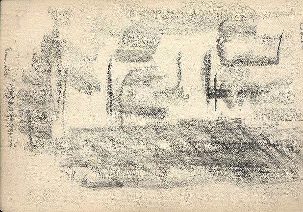 Two charcoal sketches by Reus on both sides of paper. An impressionist drawing of a boat on the water, some masts and the old gate of Dortrecht in the background. On the back is an uncompleted landscape.