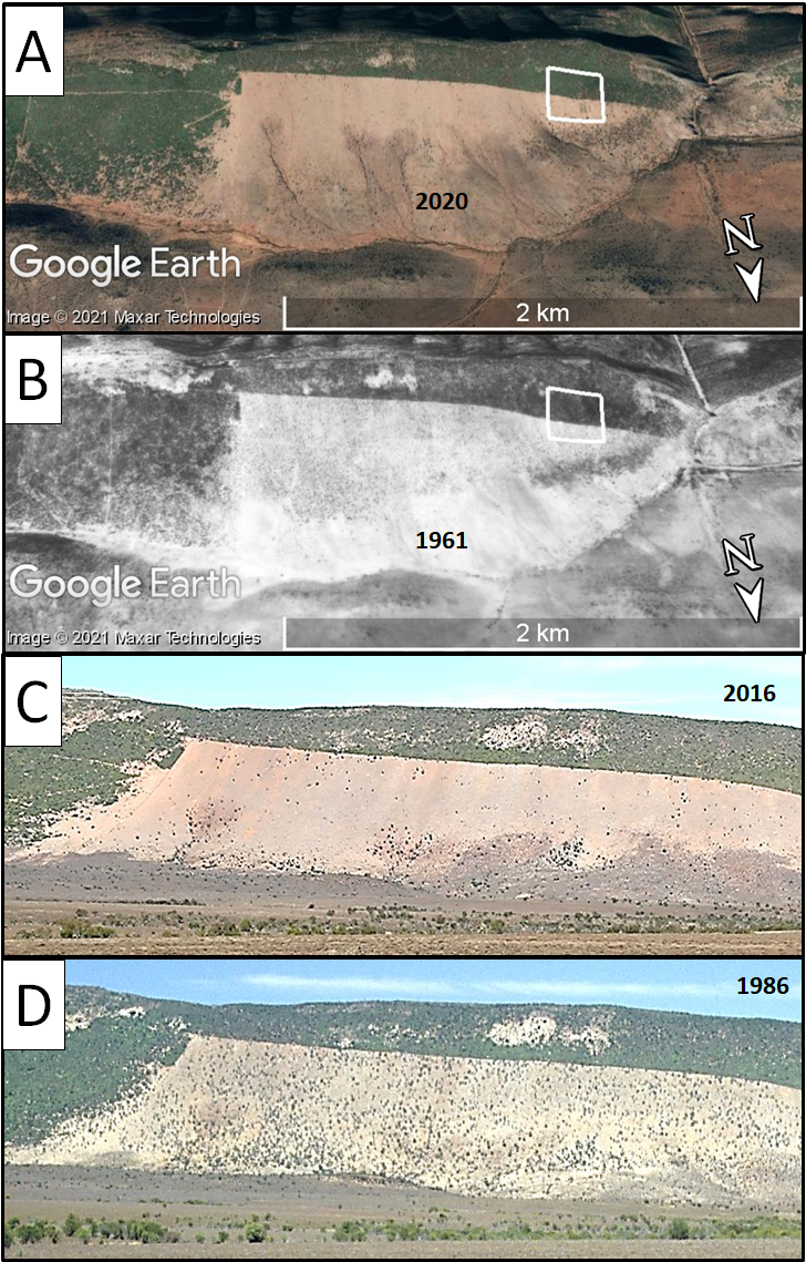 Supplement 1 : Evidence of long-term degradation of the Sundays Arid Thicket (Albany Subtropical Thicket biome) on the slopes of the study site. Aerial images show that this degraded state has been in effect for at least 60 years: (A) satellite image from 2020 (Map data: ©2021 Google Earth, Maxar Technologies), (B) aerial photo taken in 1961 by the South African Chief Directorate of National Geo-spatial information (Reproduced under Government’s Printer Authorisation [Authorisation No. 11851 dated 08 September 2021]). Ground-based repeat photography demonstrates the loss of the majority of remaining trees since 1986: photos taken in (C) 2016 and (D) 1986 (Photo credit: MT Hoffman). Note that, in (C) and (D), the area in this study is not in the area photographed (it is off to the right). DOI: 10.7717/peerj.12176/supp-1