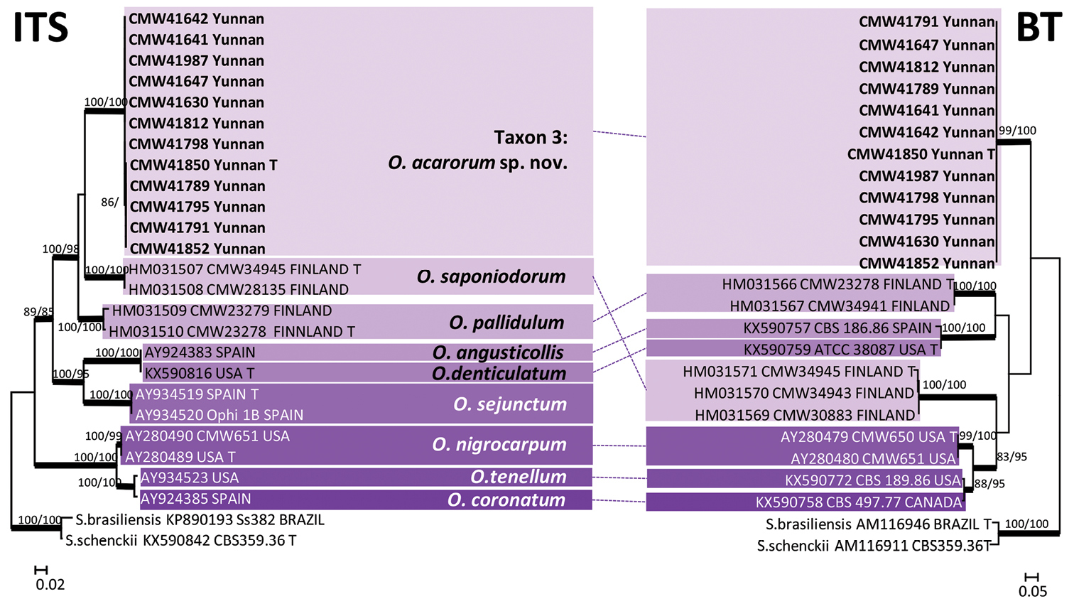 | dc.description | Figure S4. ML trees of the O. ips complex generated from DNA sequences of ITS and BT regions. Bold branches indicate posterior probabilities values ≥ 0.95. Bootstrap values ≥ 70 % are recorded at nodes as ML/MP. T = ex-type isolates. | en_ZA |