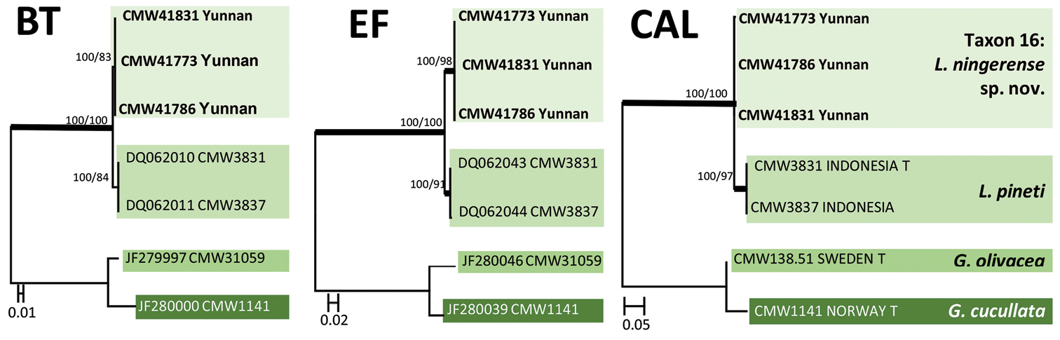 | dc.description | Figure S9. ML trees of the L. procerum complex generated from DNA sequences of BT, EF and CAL regions. Bold branches indicate posterior probabilities values ≥ 0.95. Bootstrap values ≥ 70 % are recorded at nodes as ML/MP. T = ex-type isolates. | en_ZA |