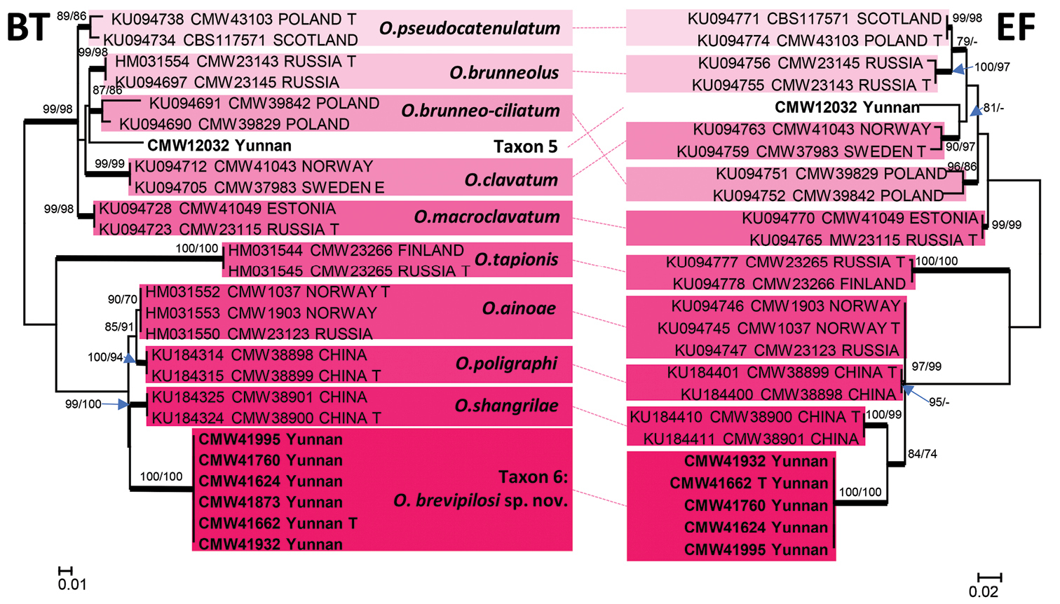 | dc.description | Figure S5. ML trees of the O. piceae complex generated from DNA sequences of BT and EF regions. Bold branches indicate posterior probabilities values ≥ 0.95. Bootstrap values ≥ 70 % are recorded at nodes as ML/MP. T = ex-type isolates. | en_ZA |