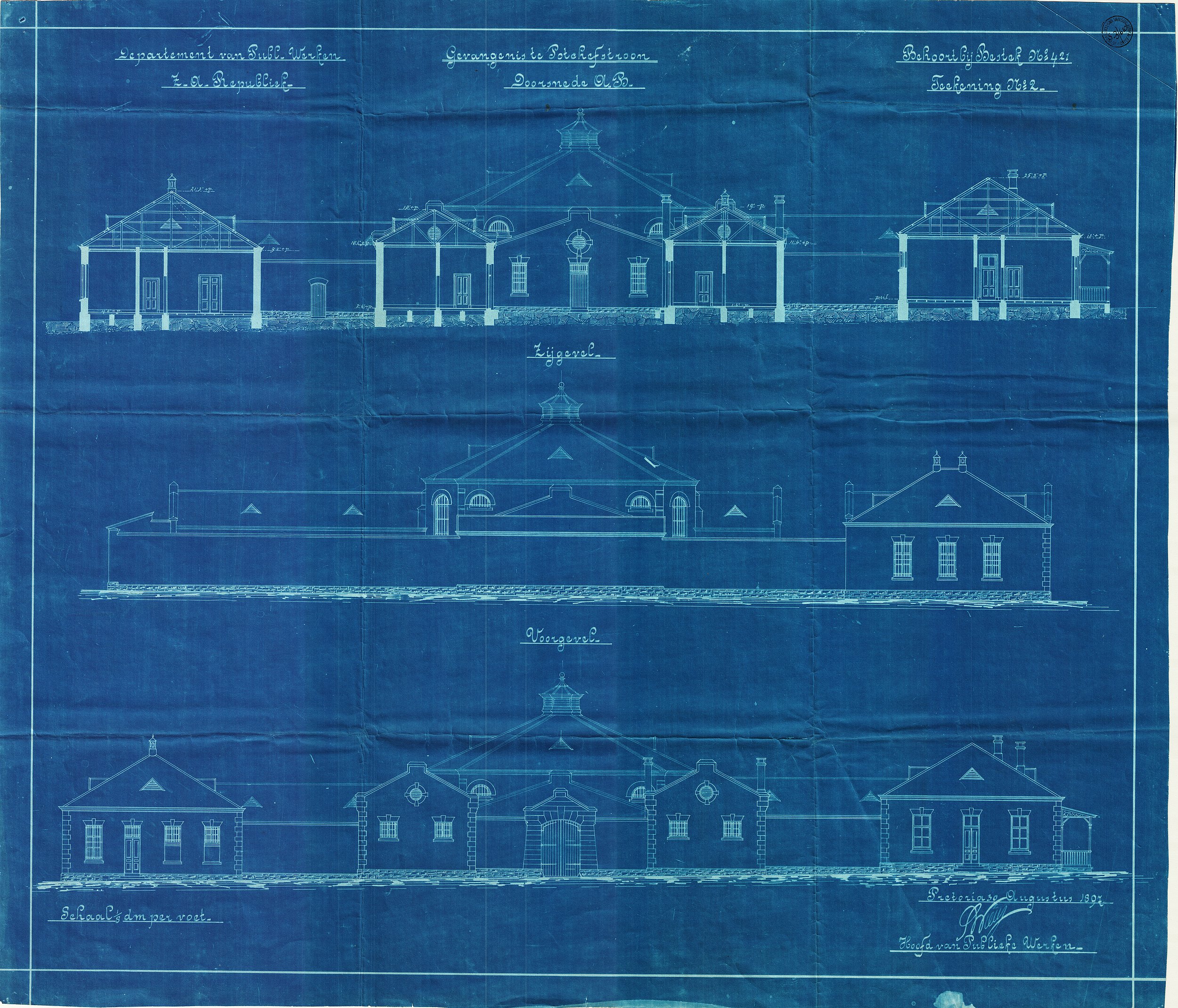 Digitised version of National Archive file S.3/610 . Drawings of the Prison, Potchefstroom, depicting the "Doorsnede, Zijgevel, Voorgevel" (Section, Side Gable, Front Gable). Signed by "S.W. Wierda, Hoofd van Publieke Werken"
