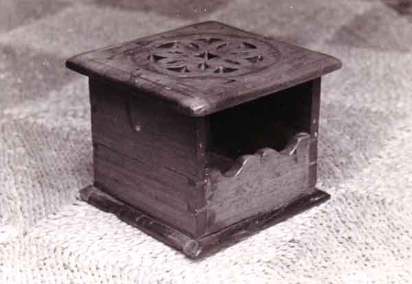 Photograph of a square, wooden komvoor, or foot warmer, with perforated top. Komvoors were regarded as utilitarian, consumable objects. A charcoal container or tessie would have been inserted through the hole or from the top, if the top was removable. This piece resembles the one at Vergelegen, shown in Plate 56 (measured by John Fassler and C. Bristol, and drawn by Pearce) on p. 160 of the 1960 edition of prof. Geoffrey Pearce's book "Eighteenth Century Furniture in South Africa".