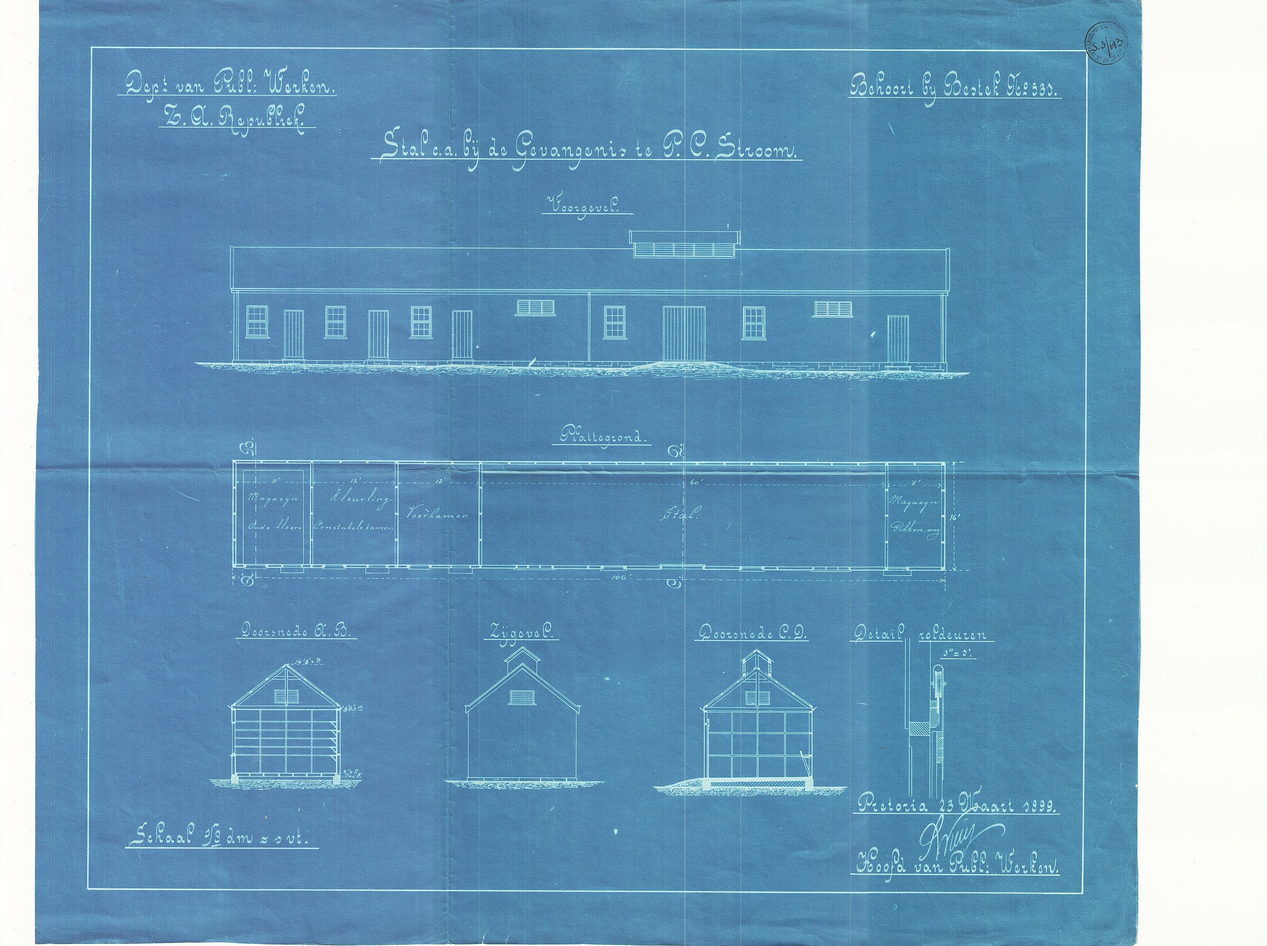 Digitised version of National Archive file S.3/613. Drawings of the stable at Potchefstroom Prison, the "Voorgevel, Plattegrond" (Front Gable, Ground Floor Plan). Signed by "S.W. Wierda, Hoofd van Publ.Werken"