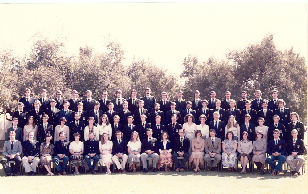 Formal colour photo taken outdoors of the 1982 BVSc graduates. The names of the graduates are: Front (from left to right): TR Shead, RT Larson, J Been, SN Taylor, A Olivier, JJE de Maudave Bestel, D Chain, JM le Roux, RM Hyde, SML Varrie (class captain), AJ Dogon, Y Beck, MI Vermooten, IR Heyns, KA Levy, JH Slaven, JBU Tebje, JH Meyer, CJ van Niekerk ; Second row: PD Eisenhammer, V Brain, GNL Fuller, RJ Walwyn, TD Marriott, SM Kotzé, SH Kotzé, MB Evans, SBH Hayes, JA Cilliers, N Fourie, JH Davies, JA Frean, CC Williamson, JJ Kroon, BE Voigts, CJ Botha, EAJ van Nieuwenhuizen, GM Ferreira, P Vervoort ; Third row: AW Makin, CB Hambly, NJ Arkell, JD Macdonald, GW Green, PL van Zyl, M Meyer, KI MacWilliam, A van Halderen, C Fourie, R Williams, PW Nel, OJ Botha, NM Duncan, KP Pettey, MA Silkstone, LJ van Niekerk, MH Bigalke ; Fourth row: H Bosman, A Hillier, AJJ du Plessis, D Nischk, HR Andrew, CJ van Dijk, CH Hesse, IM Sandler, M Ross, MW Rohwer, HJ Lategan, PN Human, J Kahts, ST Zagt, WJ Cilliers, DGH Nolte, J Walters ; Absent: F Huberts, PJ Kelly, AS Shakespeare, PW Smith, GC Stevens, AM Warren