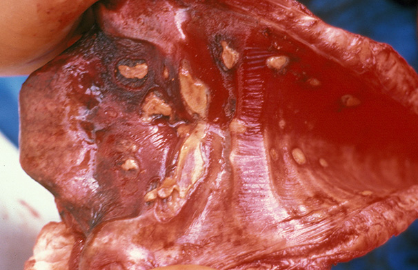 Lumpy skin disease (LSD) in a bovine showing numerous necrotic areas in the larynx and proximal trachea