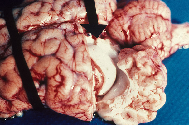 Cross-section of brain to expose the hipocampus to prepare a brain smear to confirm a diagnosis of heartwater