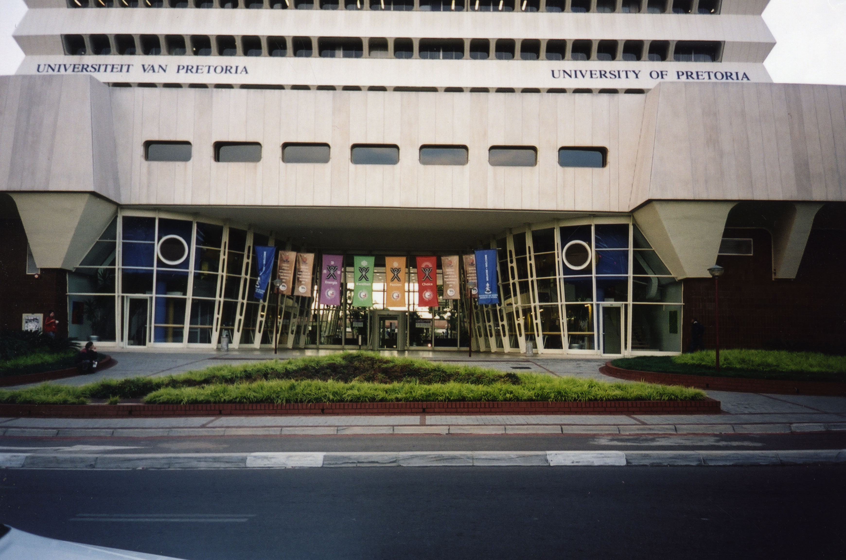 Front view of the Client Service Center with banners, Hatfield Campus, University of Pretoria.
