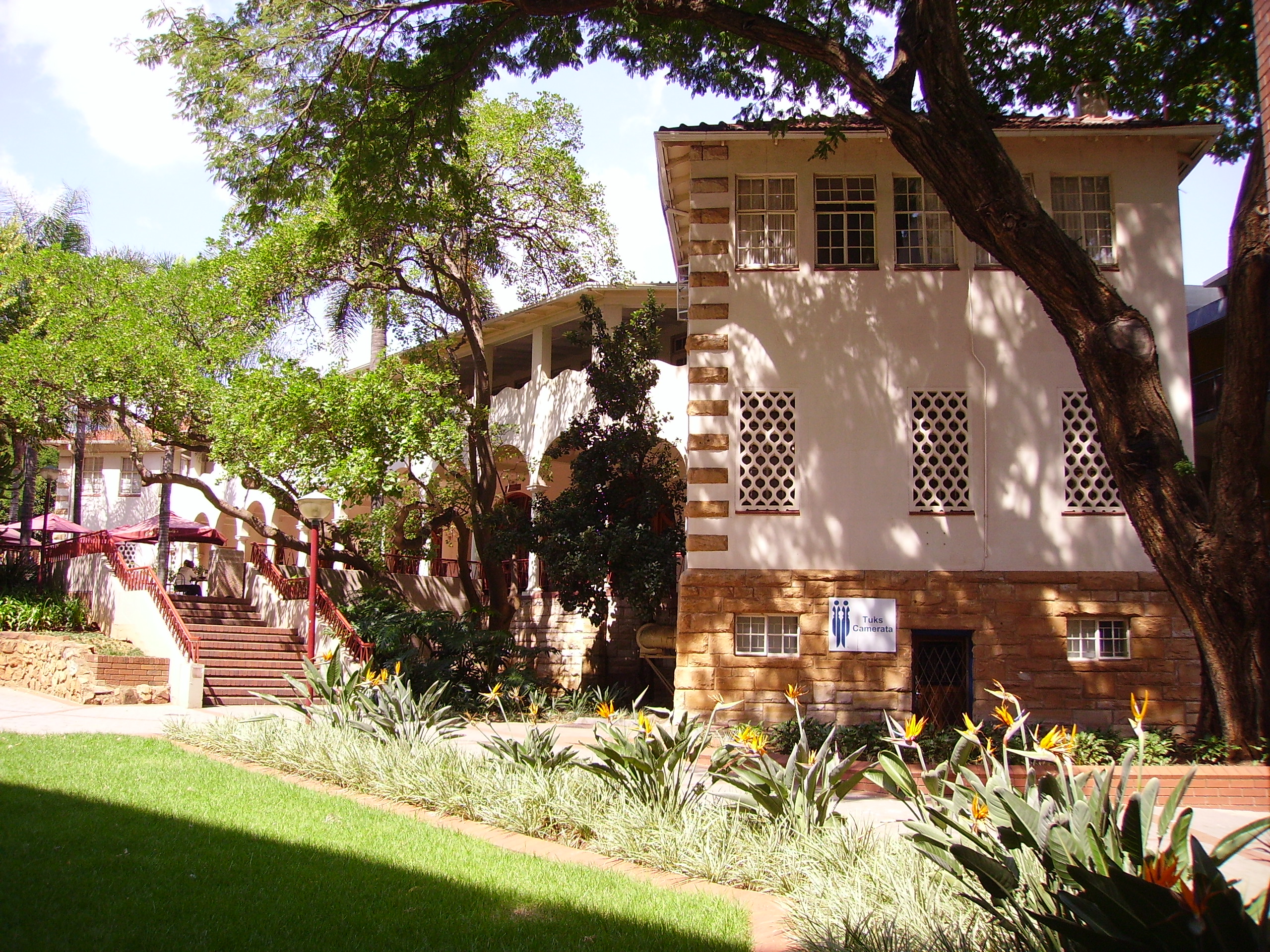 In 1929 the Transvaal University College (TUC) allocated money for the construction of a students’ social centre. Architect Gerard Moerdijk designed the new building in a style similar to that of the Student Affairs building. With both reflecting elements of the Neo-Romanesque style, the central square in front of the Old Arts building was kept symmetrical. The first level was completed in 1930 and the second level only in 1936. Major renovations in 1993 resulted in reception halls for dining and meeting purposes, as well as a coffee shop and restaurant. Of particular interest in this building are the tiles of the hearth which are reminiscent of Delft tiles, but unlike Delft, portray Africanised images showing animals, Boer settlers and African warriors. Today the Club Hall houses the Burgundy’s coffee shop and practice rooms for the UP Camerata Choir.