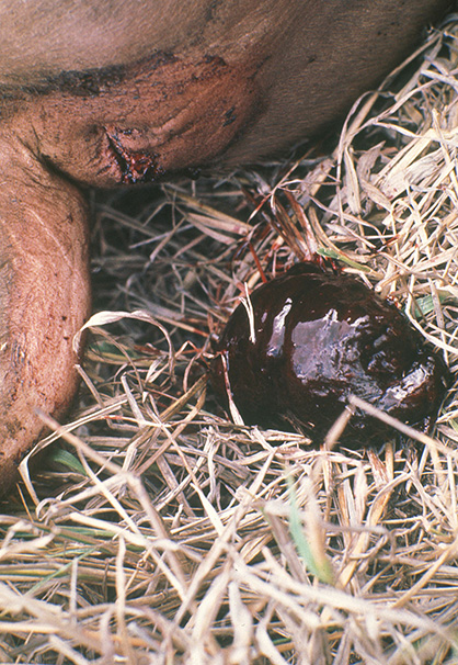 Anthrax : blood coagulum close to the anus of an animal that died of the disease