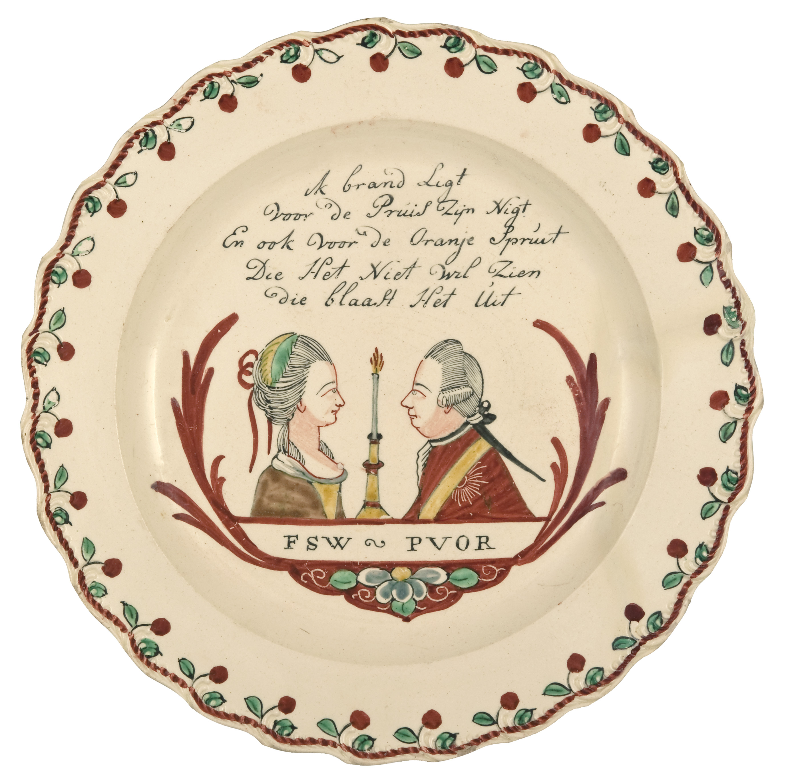 This round cream-ware plate with a foliated rim decorated with a cord and orange fruit border pattern has two portraits from the side of Willem V and his Queen surrounded by a leaf scroll and a burning candle between them. Below the Queen are the letters FSW and below Willem the letters PVOR. Above the figures is the inscription: “ik brand Ligt / Voor de Pruis Zijn Nigt / En ook voor de Oranje Spruit / Die Het Niet wil Zien / die blaast Het Uit” (I burn a candle / for the the Prussian Girl / as well as the Child of the House of Orange / those who doesn’t like it must try to stop it). This is one of the oldest plates in the Van Gybland Oosterhoff Ceramic Collection dating to 1784 and it was made by a ceramic factory in England.