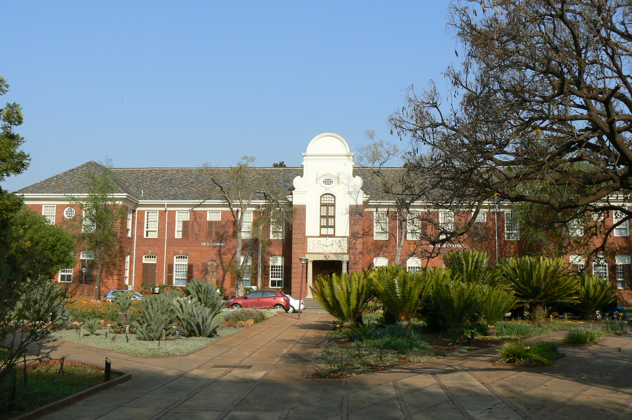 Designed by J B Dey of the Department of Public Works in 1917, this impressive building was only completed in 1921 after the end of the First World War and was officially opened by General Jan Smuts. Initially home to the Department of Agriculture, the building now houses the Departments of Consumer Science and Food Sciences. The prominent façade of the building with its white painted gable reflects elements of the Cape-Dutch style. A relief panel on the gable depicts mythological figures and beautifully carved wooden fanlights adorn the main entrance. A fire destroyed the top floor of the building in 1975, but the building was restored to its original condition.