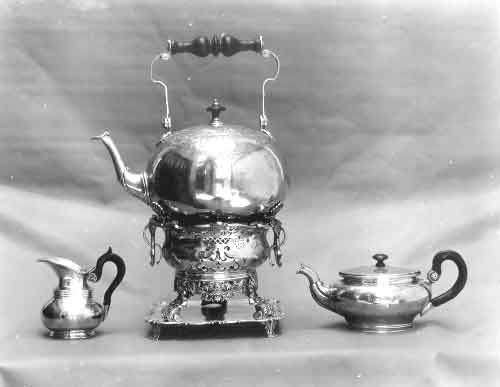 From the Pearse Collection: photograph depicting a silver tea kettle on two stands (one could be an ornately decorated komvoor), with a tea pot and a milk jug, the last two probably from the last quarter of the 18th century. Photograph may have been taken for prof. Geoffrey Pearse's book "Eighteenth Century Furniture in South Africa", but never included.