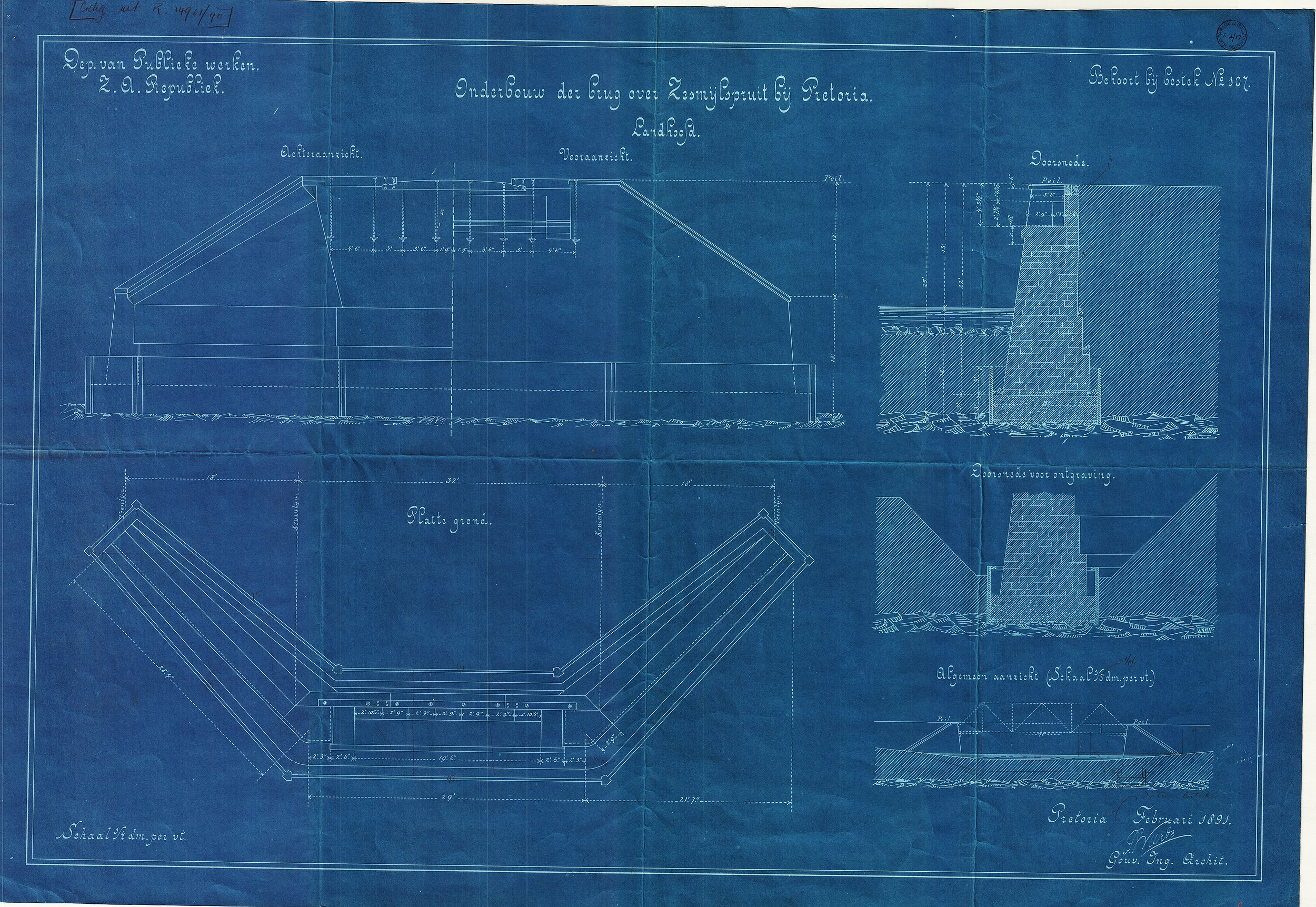 Digitised version of National Archive file S.2/17 of the substructure of the Sesmylspruit Bridge, Pretoria, signed by "S.W. Wierda, Hoofd, Publieke Werken"